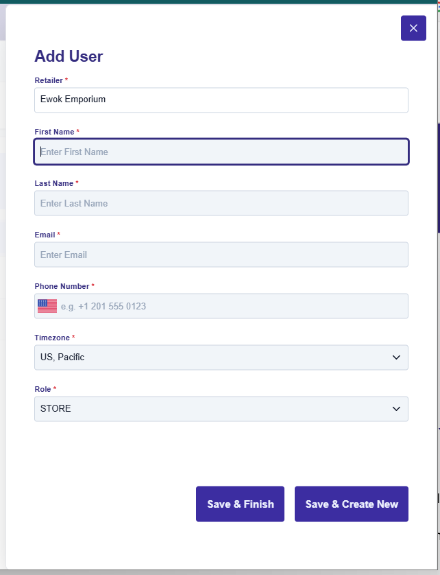 When you're done, click Save & Finish to save the User and return to the Users tab, or Save & Create New to save the User and add another user.
